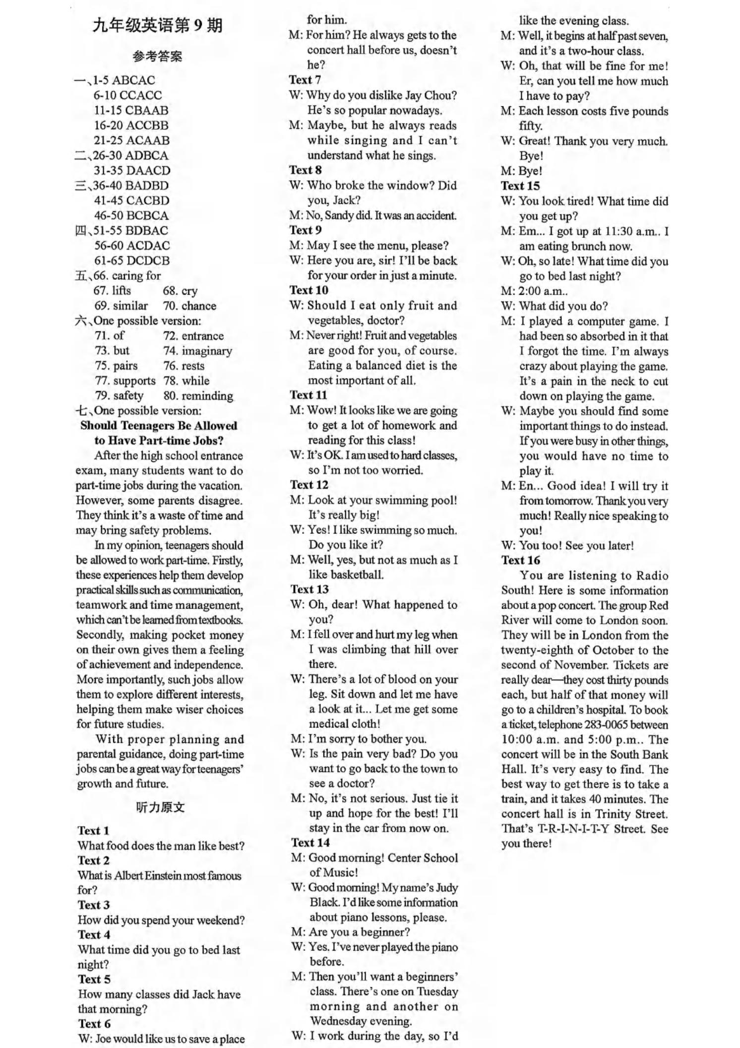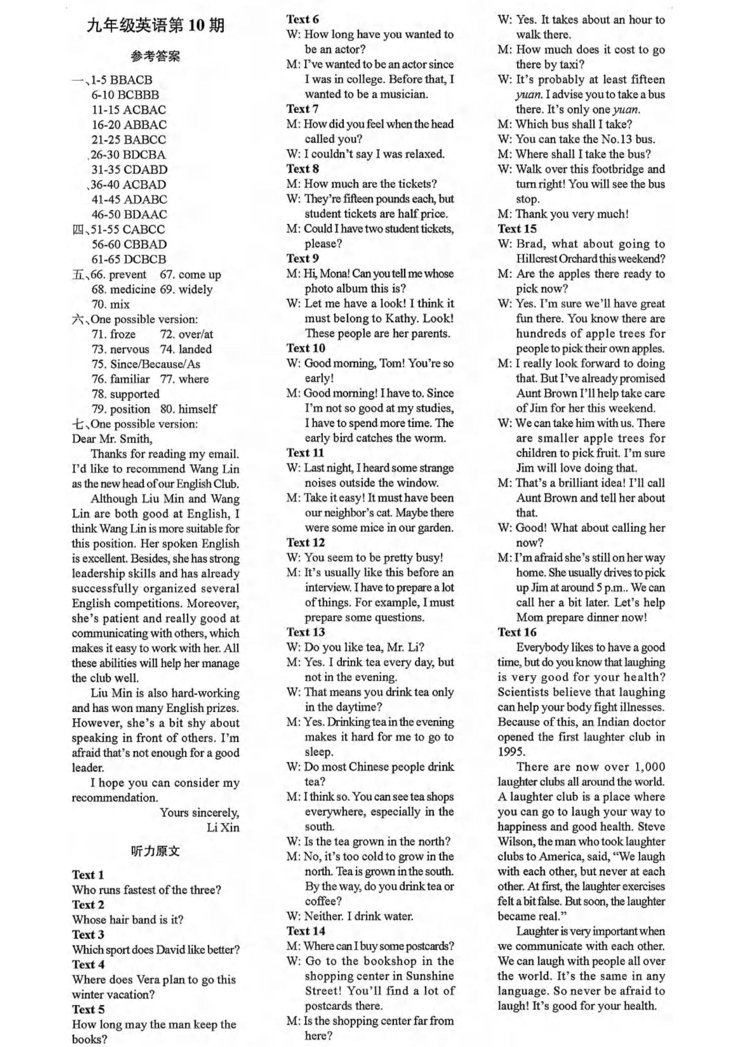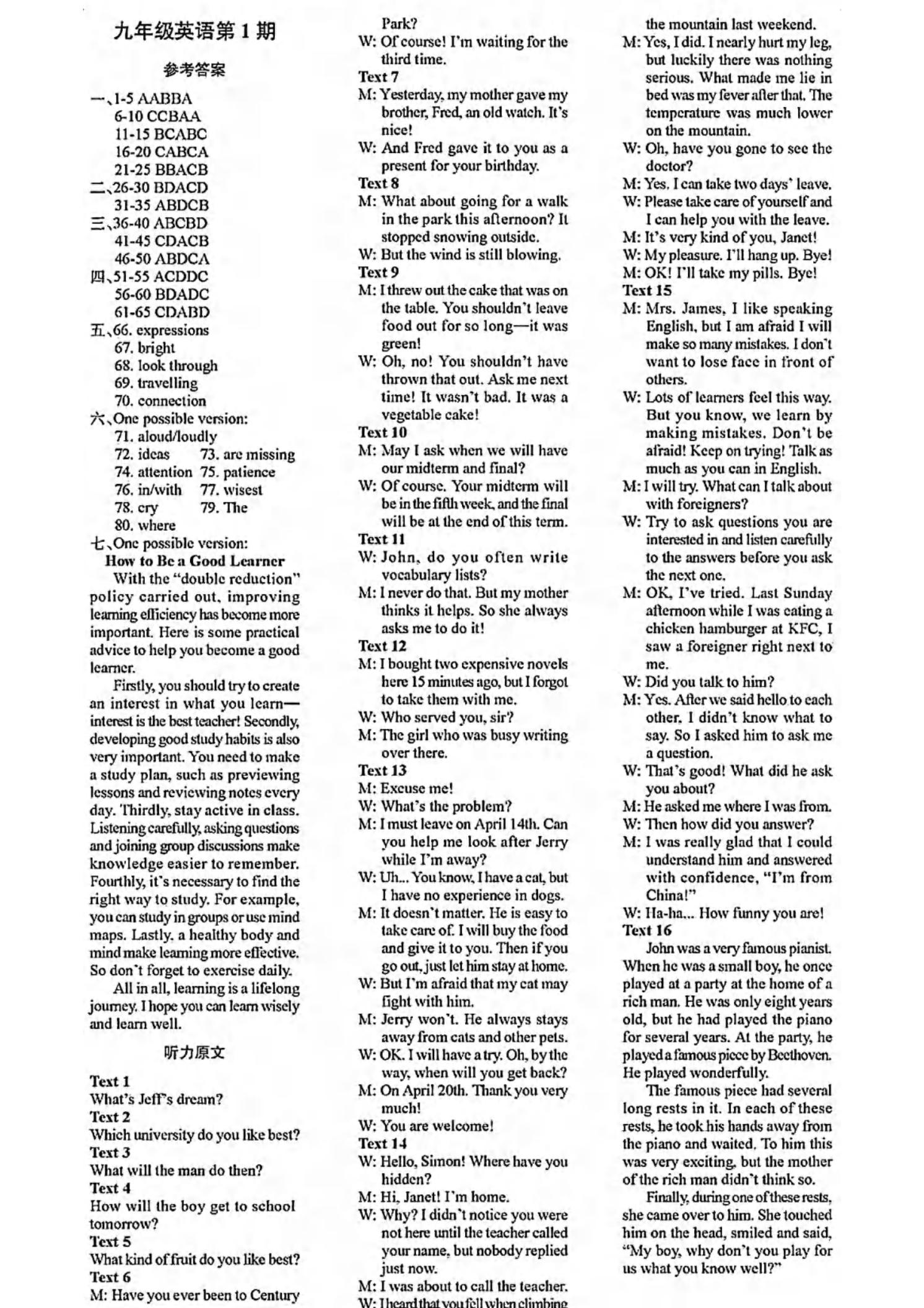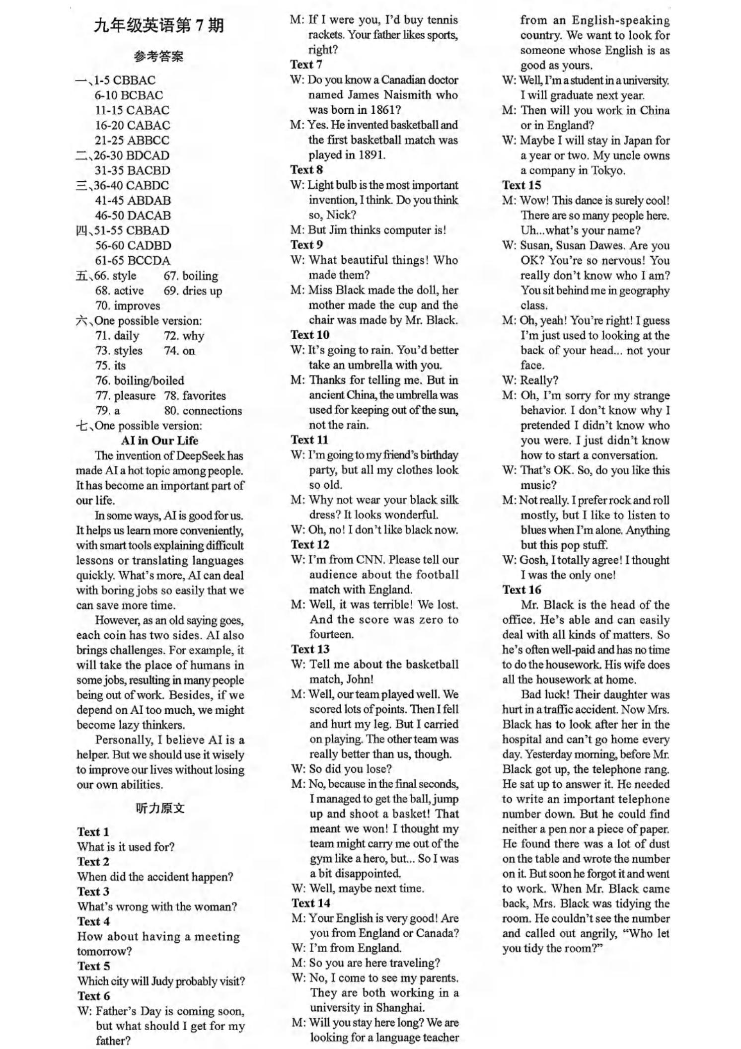 阳光英语周刊2025-2026学年九上英语第1-10期参考答案及听力稿
