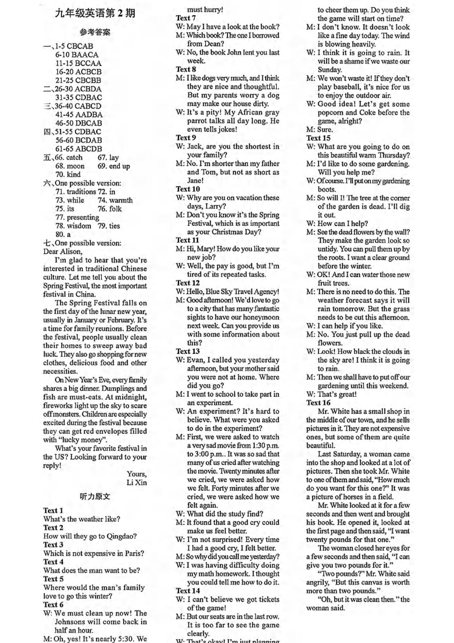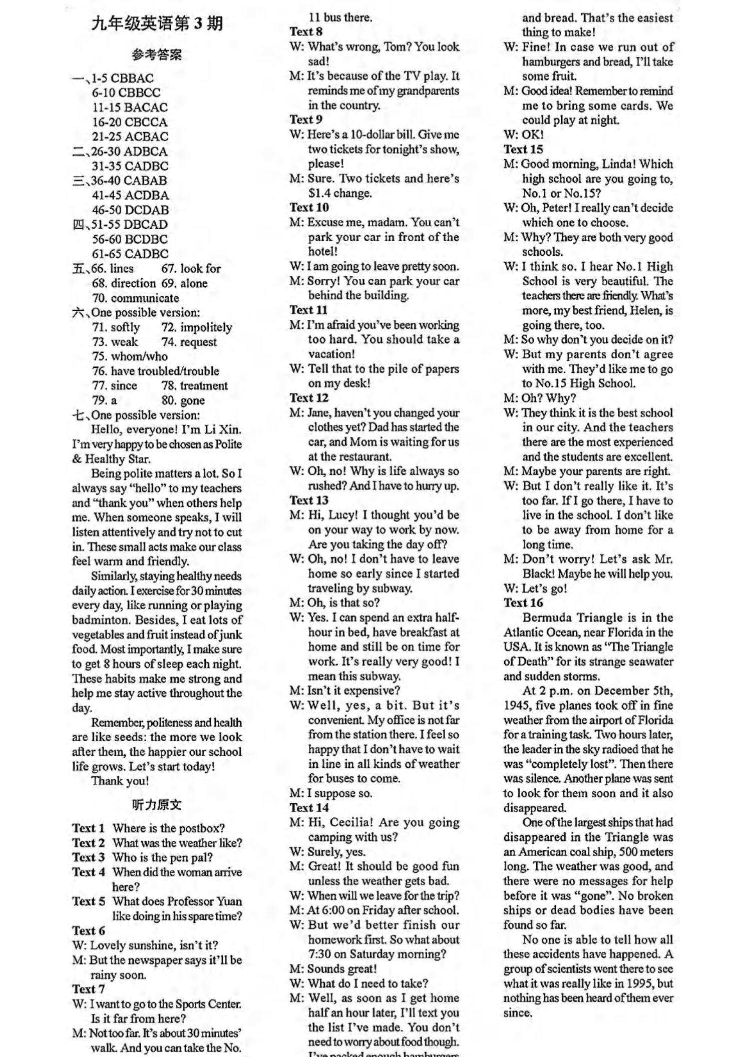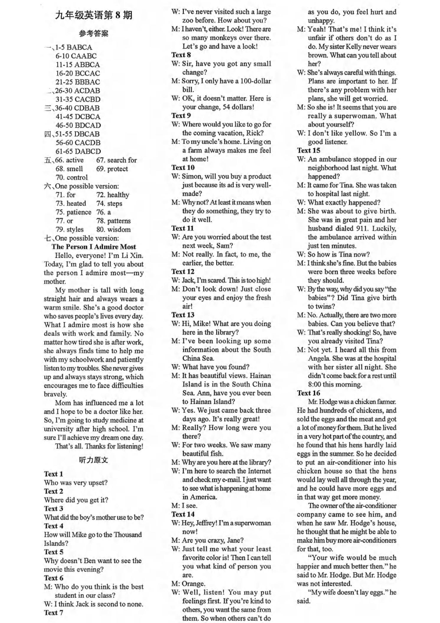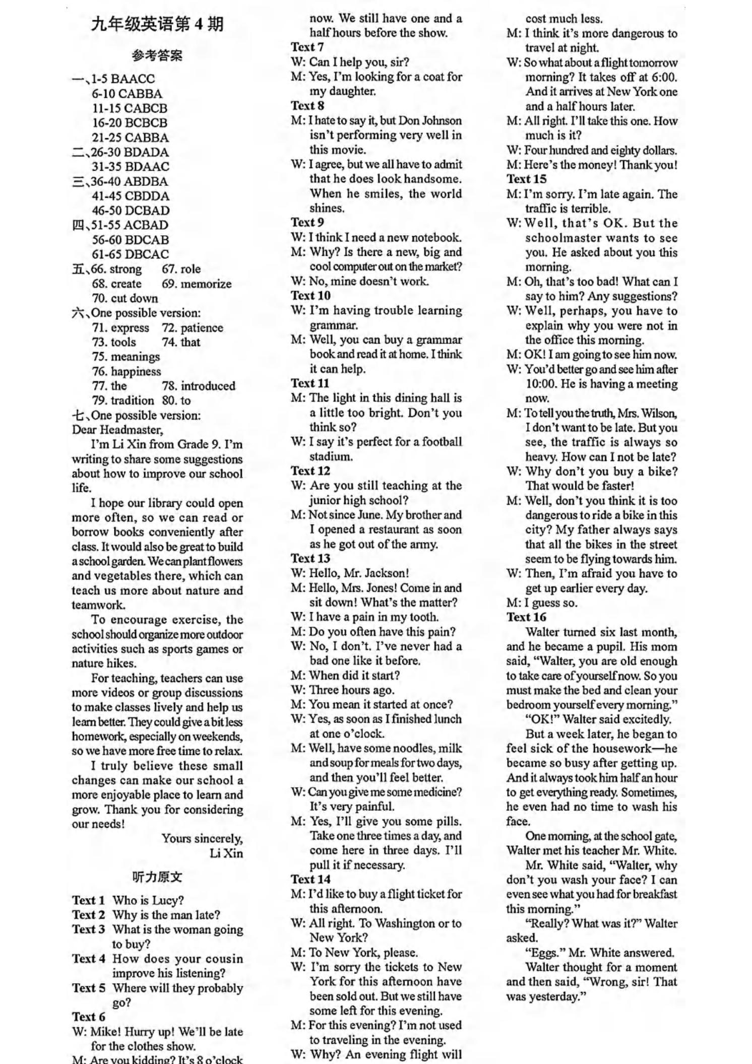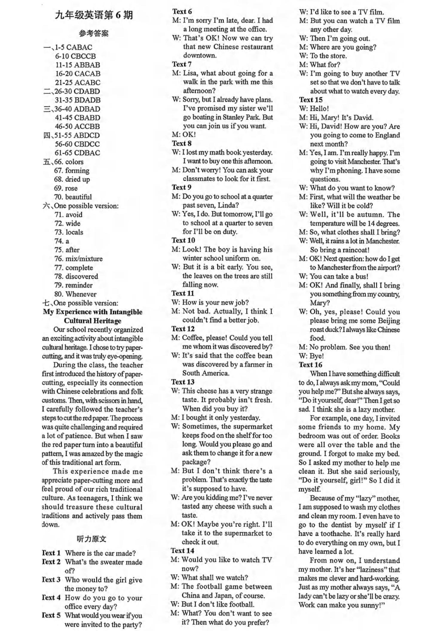 阳光英语周刊2025-2026学年九上英语第1-10期参考答案及听力稿