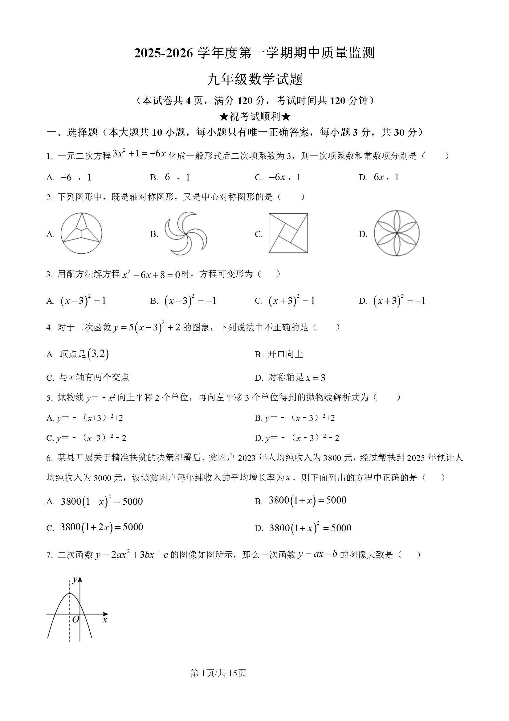 - 1荆州市2025-2026学年度第一学期期中九年级数学试卷(word版含答案)
