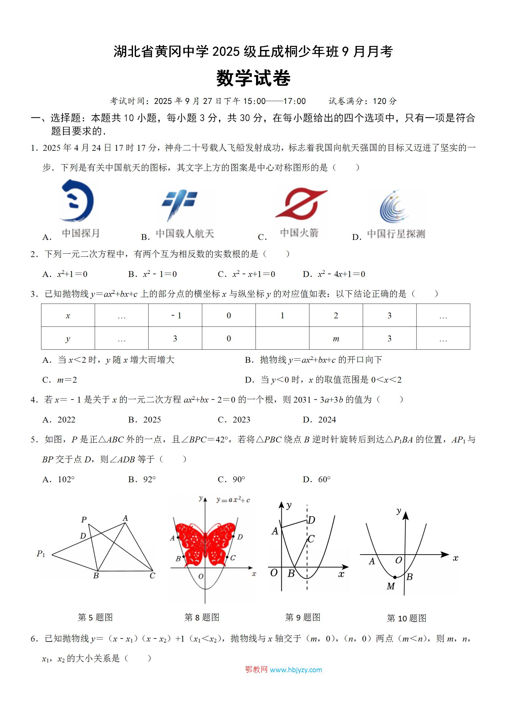 - 5【免费】黄冈市实验中学2025-2026学年九年级9月月考7科试题(PDF版含答案)
