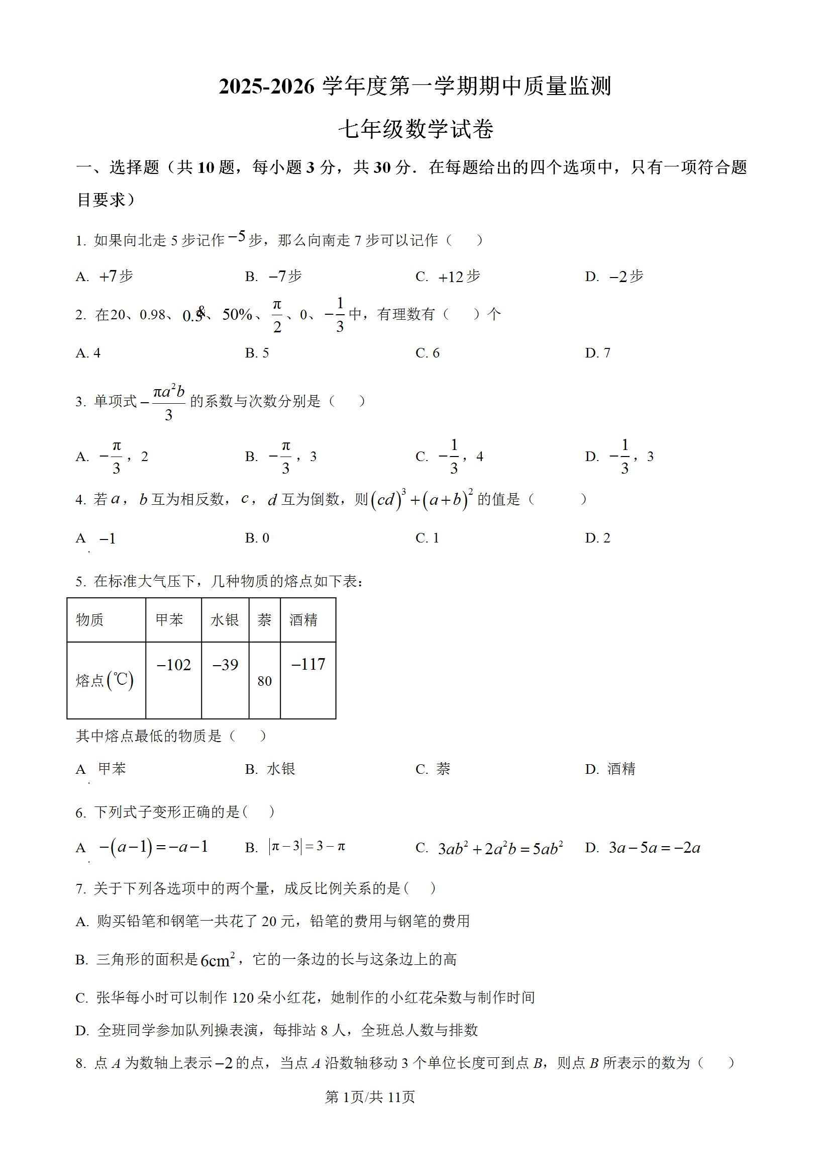 - 1荆州市2025-2026学年度第一学期期中七年级数学试卷(word版含答案)