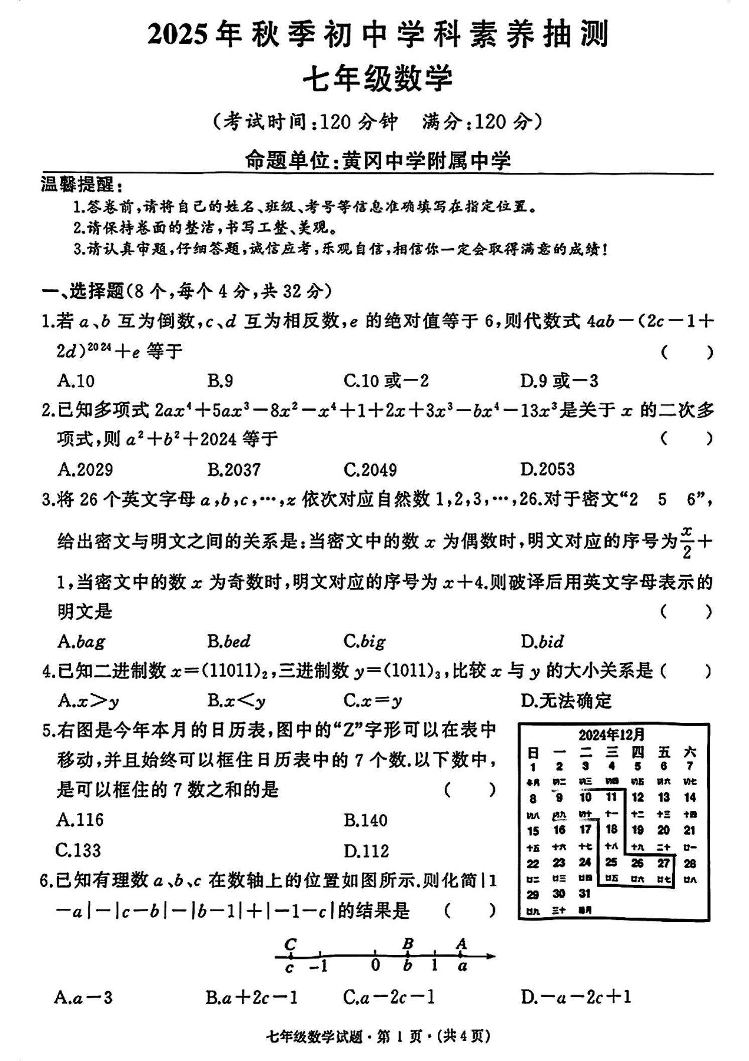 黄冈中学附属中学2025-2026学年上学期七年级数学竞赛试题(PDF版)