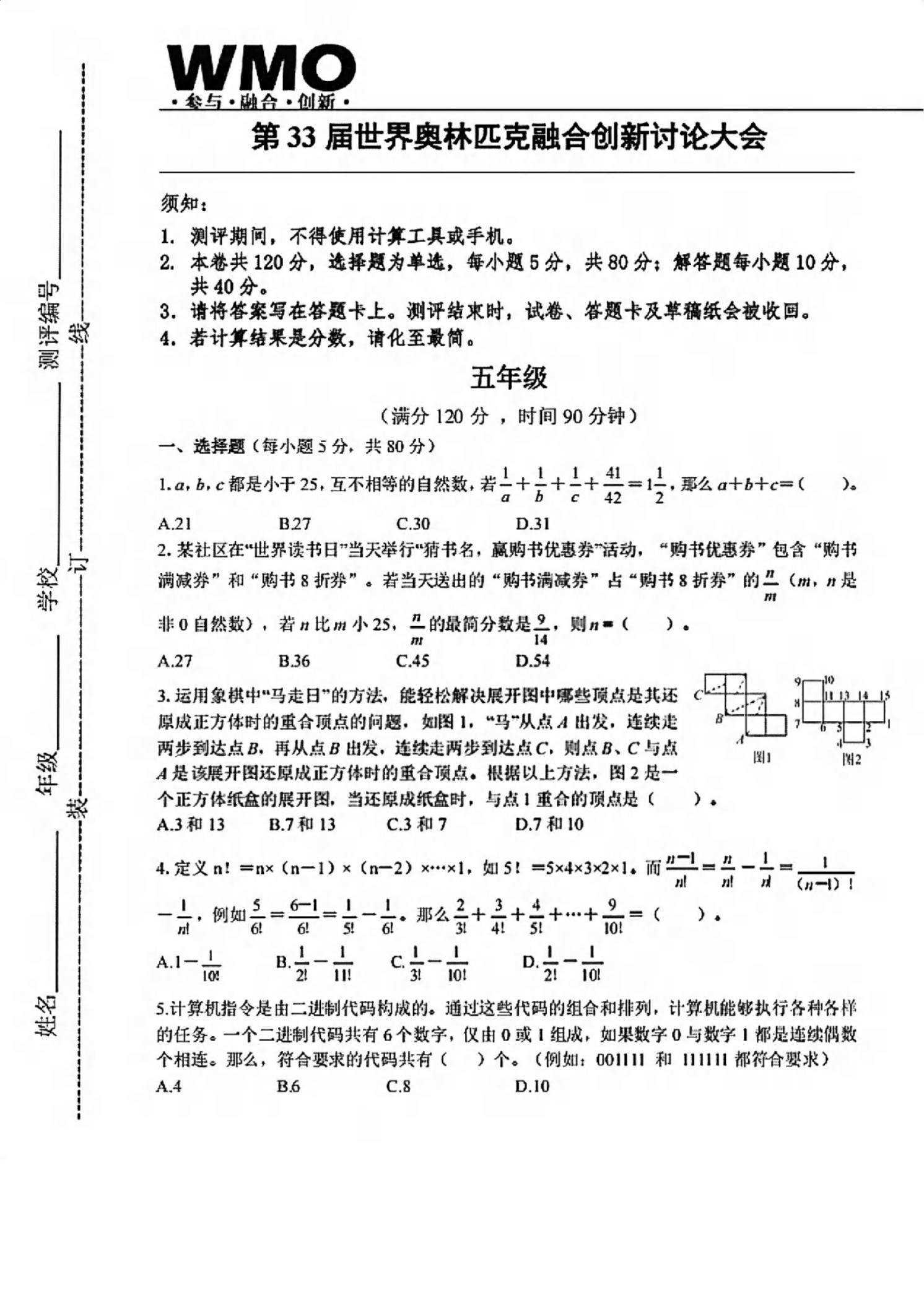 - 1【免费】2025年第33届世奥赛五年级数学复赛试题(PDF版含答案)